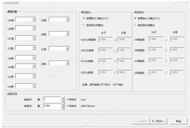 波形反演參數(shù)設(shè)置界面包含 “ 試驗(yàn)線路選擇 ”“ 通道設(shè)置 ”“ 電壓變比 ”“ 電流變比 ”“ 相系數(shù)設(shè)置 ”“ 試驗(yàn)區(qū)間 ” 等模塊,底部有 “ 上一步 ”“ 下一頁 ”“ 取消 ” 按鈕 。