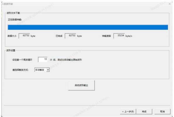 數(shù)據(jù)傳輸與波形輸出界面包含 “ 數(shù)據(jù)傳輸狀態(tài) ”“ 波形設(shè)置 ”“ 觸發(fā)方式選擇 ” 模塊,顯示數(shù)據(jù)大小、已完成字節(jié)數(shù)、傳輸速率,底部有 “ 上一步 ”“ 完成 ”“ 取消 ”“ 啟動(dòng)波形輸出 ” 按鈕 。